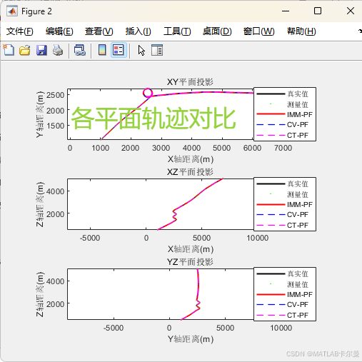 - 三维轨迹对比图 & 三视图(XY/XZ/YZ投影): 直观展示真实轨迹、带噪声的观测点、以及单一 CV-PF、单一 CT-PF 和融合 IMM-PF 的跟踪轨迹。