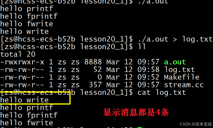 很正常,四条消息,但是由于write是系统调用 , 直接到文件内核缓冲区 ; 其他的库函数是先放在C标准库的的缓冲区,后面才被刷到os。