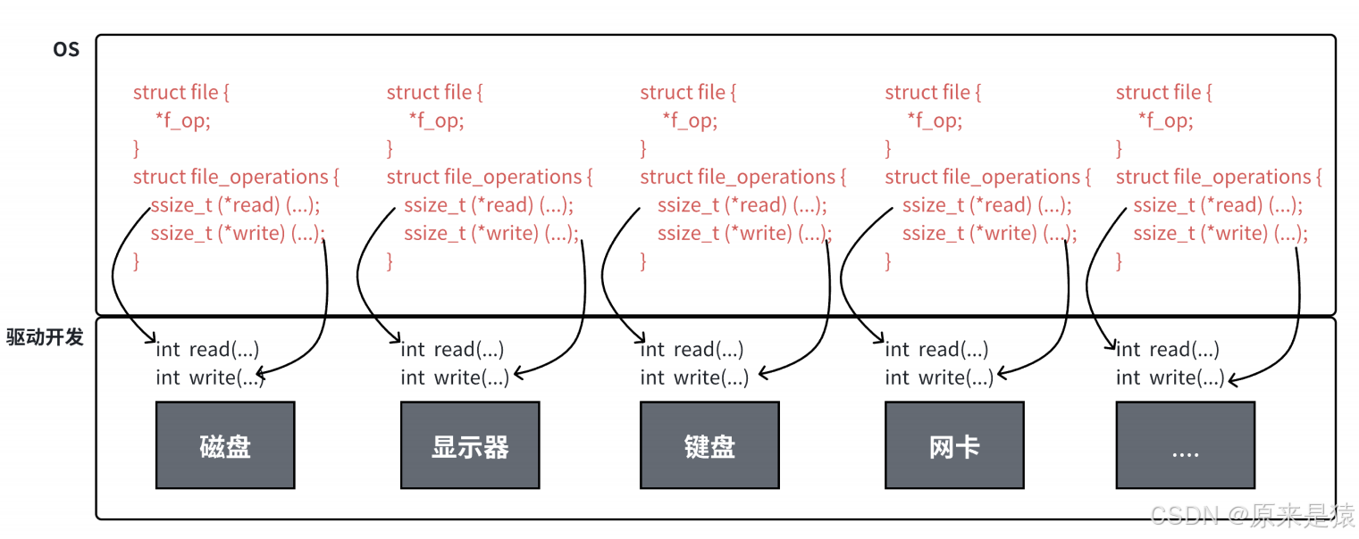 struct file_operations函数指针集,为不同资源实现不同的底层操作(比如键盘的read和磁盘的read实现完全不同)- 对系统:架构简洁,可扩展性极强