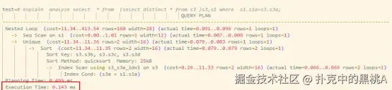开启下推优化后:连接条件被下推至子查询,s3 利用索引扫描(Index Scan)仅处理 2 行数据,执行时间骤降至 0.143ms,性能提升约 600 倍。