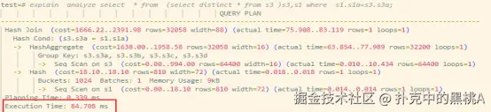 未开启下推优化时:子查询对 s3 全表扫描(Seq Scan),去重后生成 32200 行中间结果,执行时间为 84.788ms。