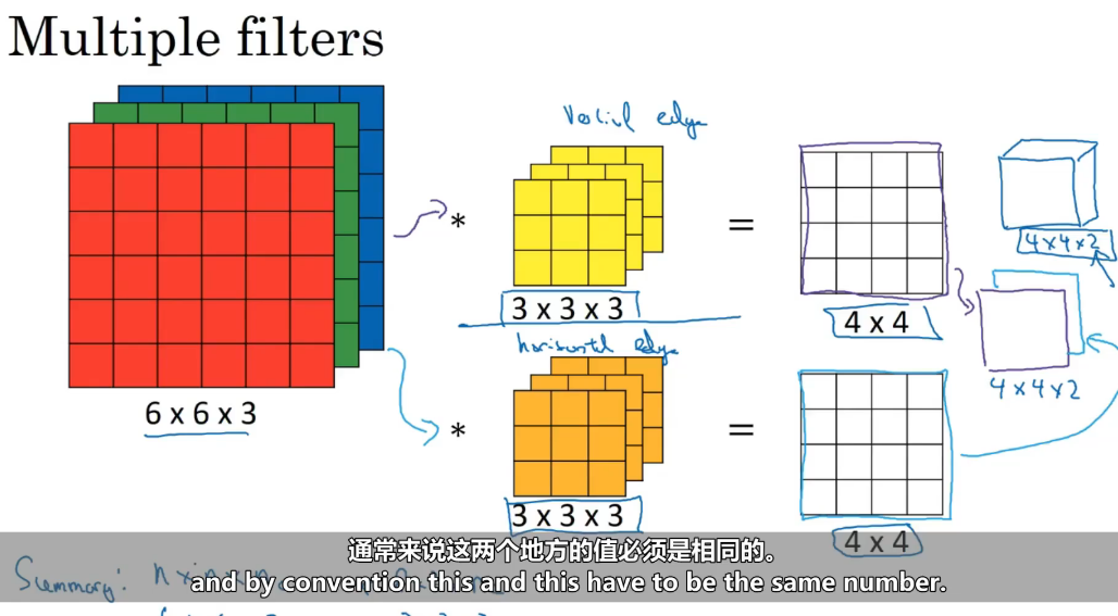 │ 卷积核2(3×3×3)→ 检测水平边缘 → 输出4×4 │