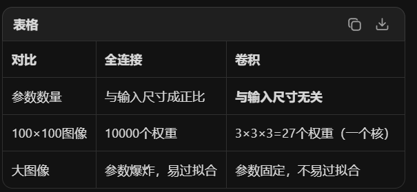 *传统全连接:每个输入像素 → 每个输出神经元 都有独立的权重 1000×1000图像 → 100万个神经元 = 10^12个参数 ❌ CNN参数共享:一个3×3卷积核(9个参数)扫描整张图像 无论图像多大,这个核只有9个参数 ✅就像用一个放大镜(卷积核)扫描照片,放大镜的"镜片"(权重)是不变的。无论看照片的哪个位置,判断"是否有边缘"的标准是一样的。 为什么有效? 因为图像的统计特性具有平移不变性------一张猫的照片,猫耳朵的特征在左上角和右下角应该被同样识别。