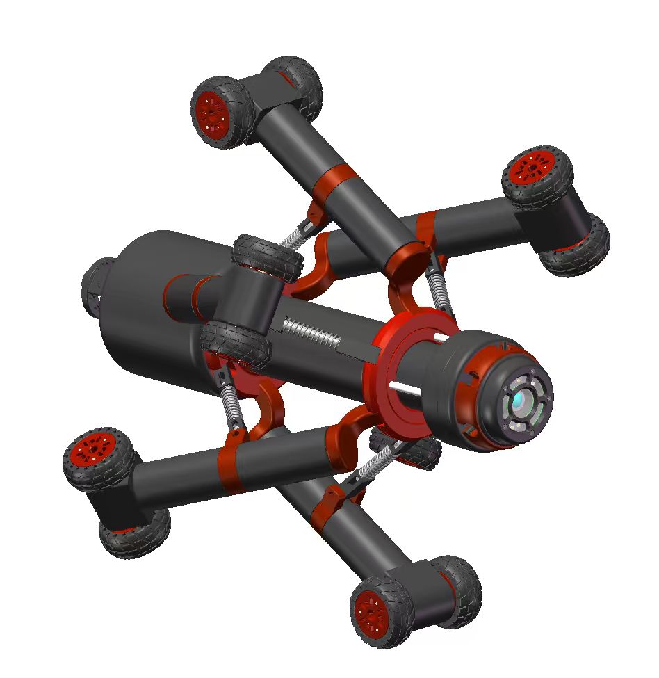 该机器人采用多组弹性轮组 + 可伸缩支臂的复合行走结构,支臂内置弹簧阻尼与丝杠调节机构,可根据管道内径实时调整轮组支撑姿态,实现对 300--700mm 内径管道的全覆盖适配: