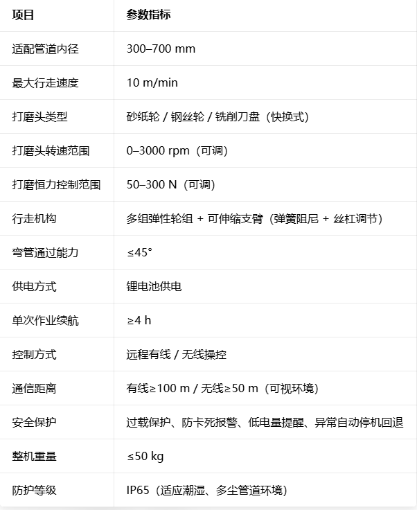 在油气输送、市政给排水、化工流体输送等工业场景中,管道内壁因腐蚀、结垢、焊缝凸起及施工残留等问题,会严重影响介质输送效率与系统安全。传统人工打磨或简易机械处理方式存在作业空间受限、效率低下、质量不均等痛点。本文介绍一款适配内径 300--700mm管道的打磨机器人,其凭借模块化行走机构与精准打磨执行系统,为管道内壁修复提供高效、安全、自动化的解决方案。