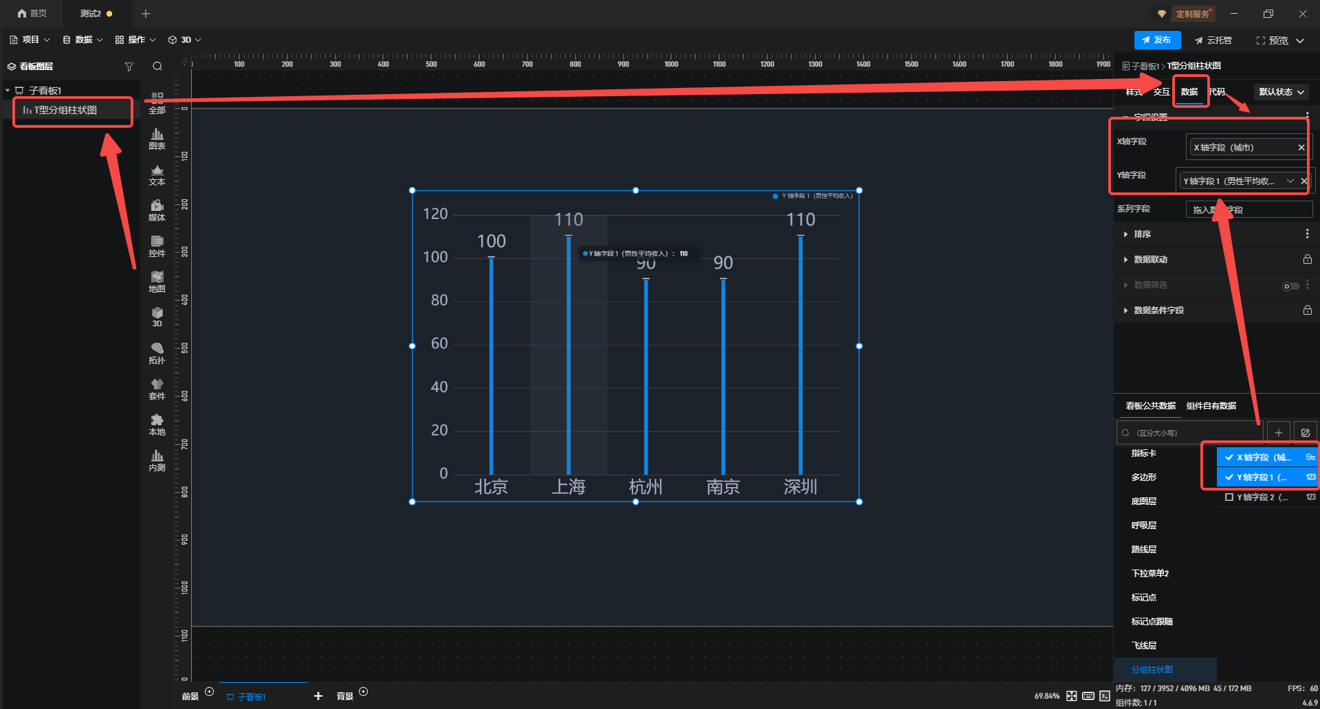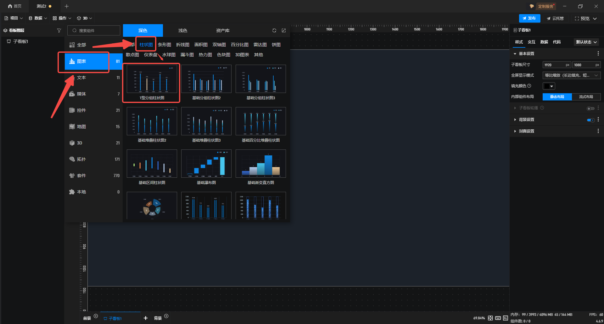 1.在左侧组件库中选择并添加**"T型分组柱状图"**组件至项目内,本文将以该组件为例进行讲解,其他图表组件可参照相同方法操作。