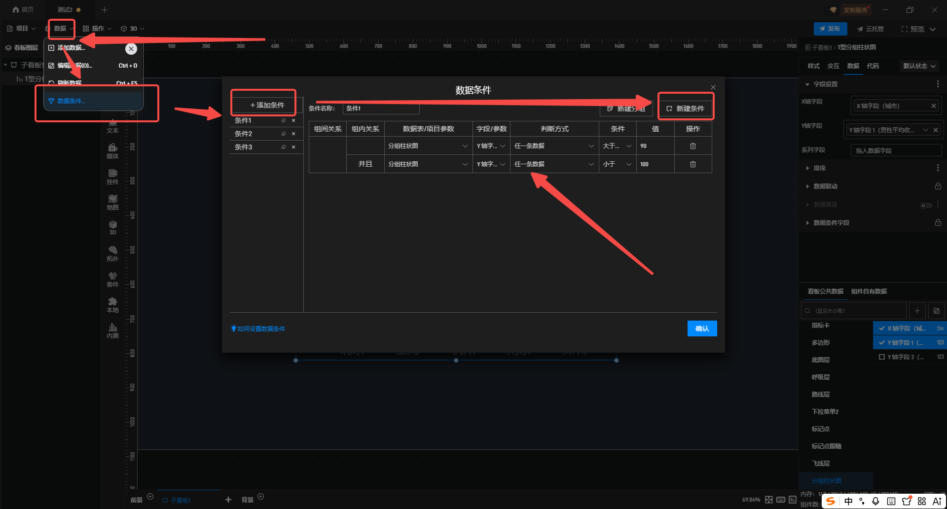 2.在左上角**"数据"** 下添加**"数据条件"** ,依次选择**"数据表/项目参数"** ,并配置对应的**"字段/参数"** ,"条件" 和**"值"**,最后点击确认即可。