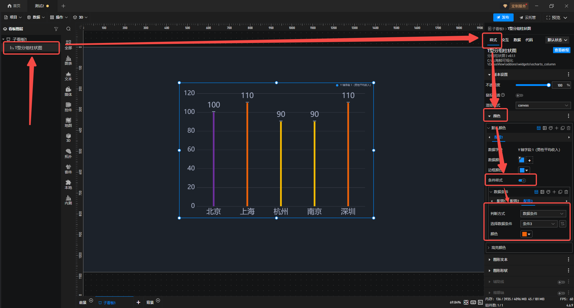 3.选中图表组件,在**"样式"** 配置栏中,选择**"颜色"** 开启**"条件样式"** ,"判断方式" 为**"数据条件"** ,并选择已添加好的**"数据条件"**即可。