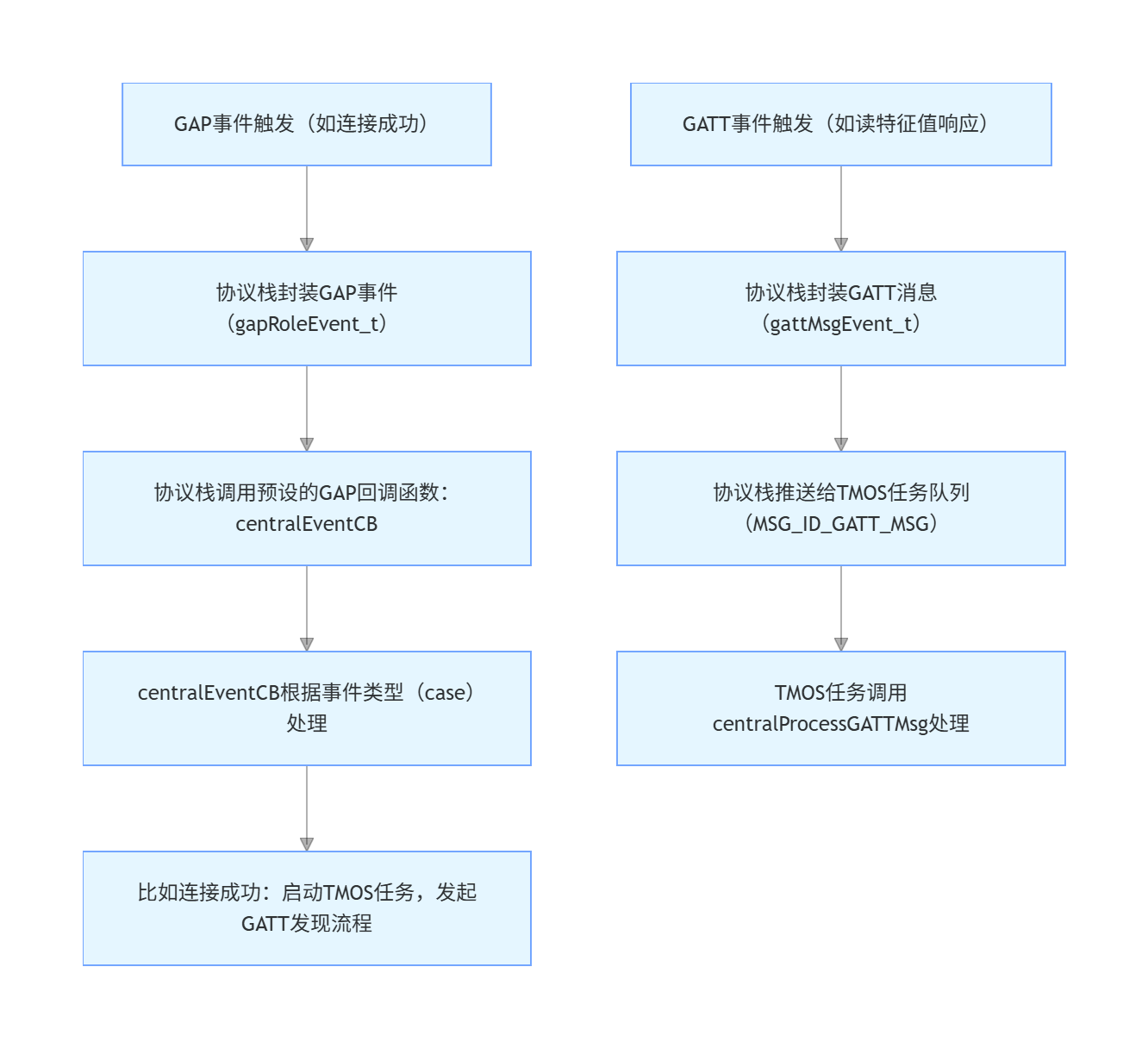 TMOS + 蓝牙协议栈的交互本质是 "异步事件驱动"。TMOS 是协议栈和应用层之间的唯一 "消息中转站" 。