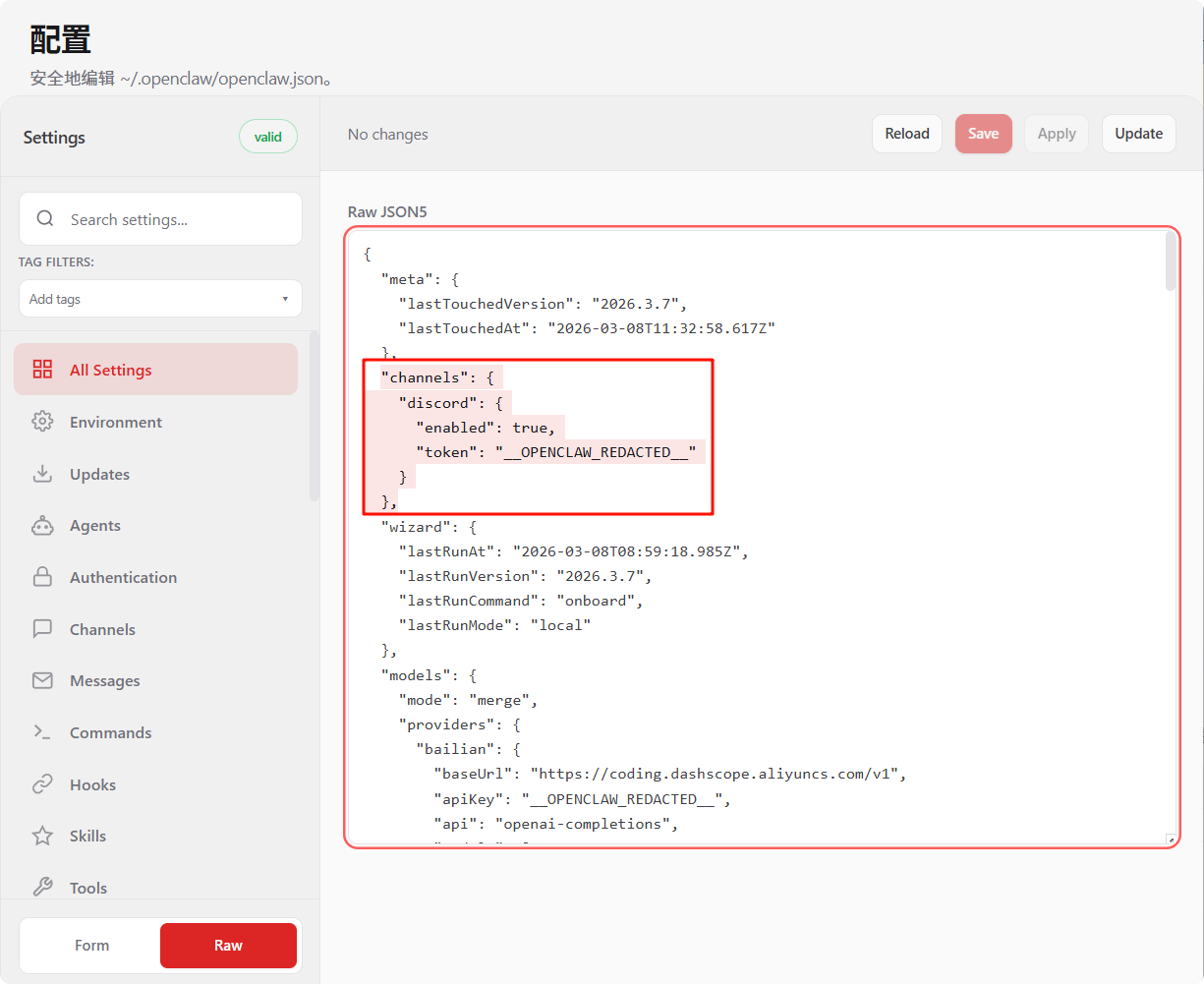 打开Openclaw控制台,在 openclaw.json 中编辑如下配置信息,将前面生成的token填入。