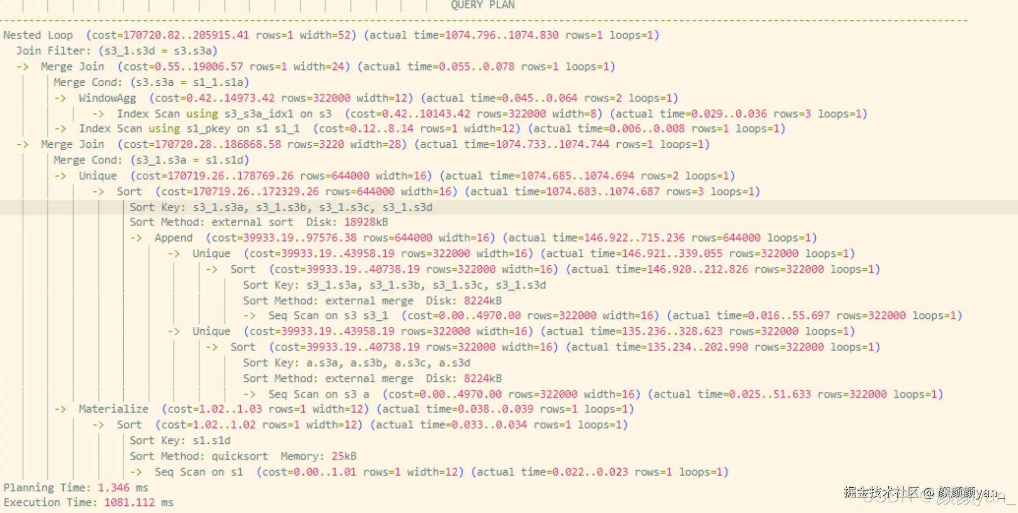 整个过程中,子查询几乎全程依赖全表扫描,I/O 与计算开销极高,执行时间约 1081ms。