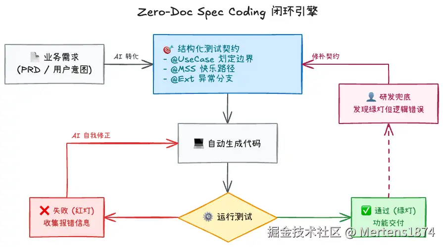 最后是生命周期的不同。 普通单测是代码的附庸,底层重构时往往跟着报废。但在 Zero-Doc 的理念下,契约是 AI 生成代码的输入源(Prompt 的具象化)。只要业务需求没变,无论底层代码被 AI 如何重写,这份契约都坚如磐石。在 Zero-Doc 的世界里,业务代码才是可以随时被 AI 抛弃和重写的衍生品,而这份测试契约,是系统唯一的、永不过时的资产。一旦契约确立,AI 便能顺藤摸瓜,生成具体的实现代码。