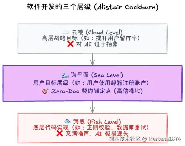 Spec Coding 强调将我们的意图锚定在"海平面"上。在这个层级,我们既不谈论虚无缥缈的愿景,也不纠缠于具体的代码实现,而是清晰地描述用户试图通过系统达成什么具体的、可观测的目标。
