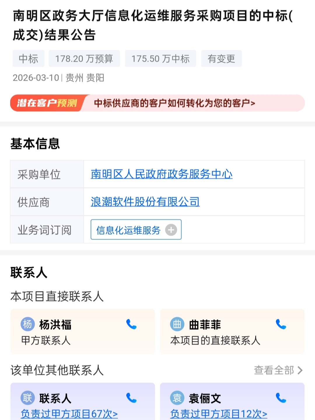 2026年3月10日,贵州贵阳发布南明区政务大厅信息化运维服务采购项目中标(成交)结果公告。该项目预算178.20万元,由浪潮软件股份有限公司以175.50万元中标,采购单位为南明区人民政府政务服务中心。