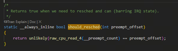 这是因为set_preempt_need_resched函数提供另一种途径在设置need resched的标志位,从而配合判断需要重新调度的接口should_resched,should_resched函数不仅要检查是否要重新调度还得检查当前的抢占计数情况(意思就是当前是否是禁用抢占的、是否是禁用软中断的、是否是禁用硬中断的),下图是没有实现arch自己的preempt.h时用默认的实现: