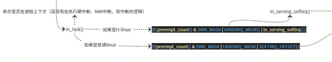 可以看到in_task里也检查了是否在in_serving_softirq的状态,如果是in_serving_softirq的状态,那么in_task也是false,所以in_task的意思是不在执行硬中断、NMI中断、软中断的逻辑,也就是纯纯的进程上下文。但是如果仅仅是bh disable,但是不在bh disable的最后可能调用的软中断回调里,那也算是in_task状态。
