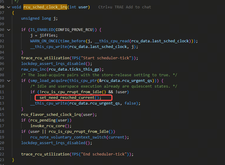上图里的这两句set_tsk_need_resched和set_preempt_need_resched已经在最新版本内核里合并成一句函数调用了: