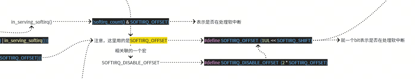 要注意SOFTIRQ_MASK包含了softirq serving的bit也包含了软中断禁用的计数bits。