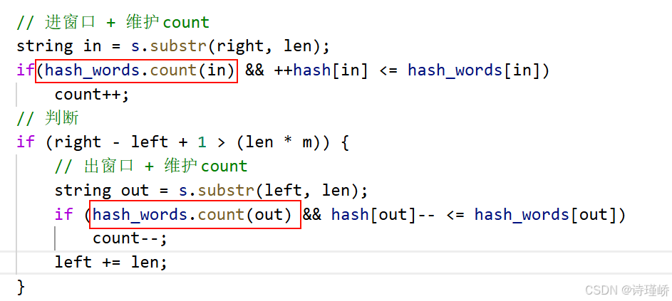 判断与出窗口:当窗口的跨度 right-left + 1 〉len *m 时,说明窗口内包含了超过 m 个单词,需要将左端点的单词 out 移出窗口。出窗口时,如果移出前该单词是"有效"的(hash[out] 〈= hash~words[out] ),则count--,随后更新 hash left 右移 len 步。