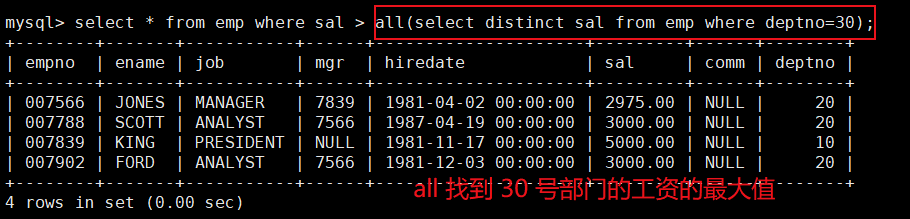 mysql> select ename,sal,t1.deptno,mymax from emp t1,(select deptno,max(sal) mymax from emp group by deptno) t2 where t1.deptno=t2.deptno and t1.sal=t2.mymax;