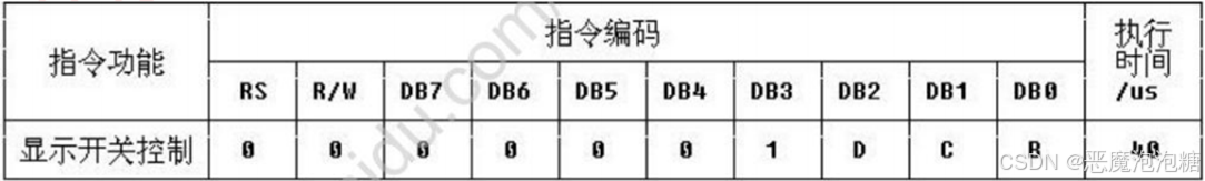 如果设置0的时候,显示功能是关闭的,1602处于关闭的显示状态,如果设置1的时候,显示功能开启的状态,那我们使用1602的话希望它开启,所以这一位设置1。