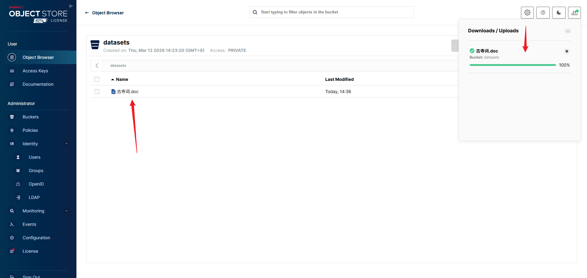 去"Object Browser"目录的面板中找到桶 对应的文件,复制路径访问测试