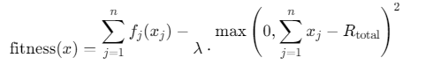适应度函数为目标函数(总效益),同时处理约束条件(资源总量限制):