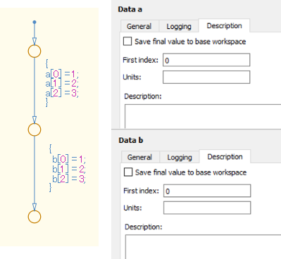 当 Stateflow Chart的属性{Action Languages} 设置为 C 时,Stateflow 的数据属性第一个索引均设置为1。![]() |