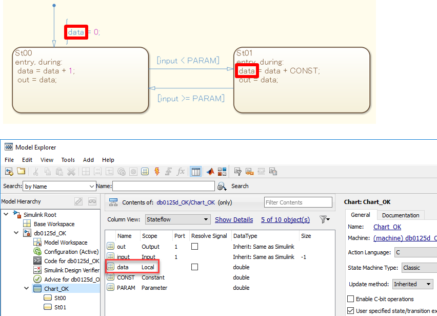 - 存在父子关系的 Stateflow 块中,局部数据名称不得重复。