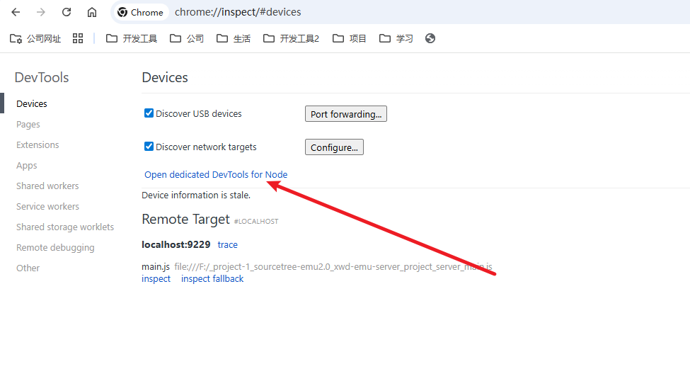 2、浏览器输入chrome://inspect,点击Open dedicated DevTools for Node。获得一个监听后端服务的服务,端口一般是9222。点击性能录制,同时操作你的前端页面。录制完成后得到一个性能监测页面如下。