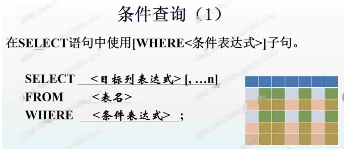 LIMIT\[位置偏移量,」行数\]; ### SELECT语句的功能 * 条件查询--按行 * 投影查询--按列 * 分组统计--按组 * 结果排序 ### 查询分类 * 单表查询 * 连接查询 * 嵌套查询 * 集合查询  ### 已建立的关系模式如下  ### 无条件查询 **在SELEGT语句中不使用\[WHERE\<条件表达式\>\]子句。**  ### 无条件查询例题        ### 无条件查询小结 * **在SELECT后面用** **表示显示所有的属性列** * **在目标列的后面使用"AS"关键词,可以给这个目标列起一个别名,注意别名要使用双引号括起来** * **DISTINCT** * * **位置:紧跟SELECT之后,在所有属性列之前** * **作用:去除查询数据中的重复元组** * **常用的函数** * * **NOWO,获取当前日期和时间,数据类型:DATETIME** * **YEARO,获得日期数据的年份,数据类型:INT** *  ### 查询条件  #### 常见的条件表达式有 ##### (1)比较条件   ##### (2)谓词条件  ##### \<匹配串\>可以是一个完整的字符串,也可以含有通配符: 1.%(百分号):代表任意长度(长度可以为0)的字符串。例如a%b1)表示以a开头,以b结尾的任意长度的字符串。如acb,abcdb,ab等都满足该匹配串。 2._(下横线):代表任意单个字符。例如ab表示以a开头,以b结尾的长度为3的任意字符串。如acb,adb等都满足该匹配串。 ##### ESCAPE'\<换码字符\>'的作用: 在模式中,当换码字符(可以任意定义为除'%'和'_'以外的字符如'/')置于通配符('%'和'_')之前时,该通配符就解释为普通字符。 注意:换码字符不能使用'\\'  ### 条件查询例题  ### 条件查询举例             ### 条件查询小结 * **某些情况下,比较条件表达式和谓词条件表达式是可以互换的** * **常用的函数** * * CONVERT(),将字符串expr转换为指定的数据类型,数据类型参数指定的数据类型 * LEFT(),获得字符串expr前端指定长度的子串,数据类型:字符类型 * RIGHT(),获得字符串expr后端指定长度的子串,数据类型:字符类型 ### 分组统计  ### 结果排序与分页显示  ### 分组统计与结果排序例题  ### 关于COUNNT(\*)的问题  ### 分组统计与结果排序例题         ### 分组统计与结果排序小结