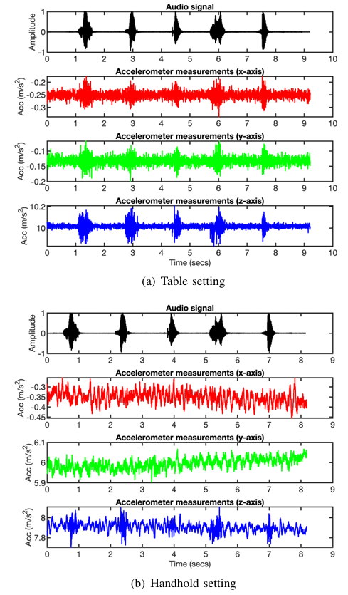 1\] "Coriolis force," https://en.wikipedia.org/wiki/Coriolis force. \[2\] "Sensor Overview," https://developer.android.com/guide/topics/sensors/ sensors overview. \[3\] "uses-permission," https://developer.android.com/guide/topics/manifest/ uses-permission-element. \[4\] ANALOG DEVICES, "ADXL150/ADXL250," https://hibp.ecse.rpi. edu/∼connor/education/EIspecs/ADXL150 250 0.pdf. \[5\] S. A. Anand and N. Saxena, "Speechless: Analyzing the threat to speech privacy from smartphone motion sensors," in 2018 IEEE Symposium on Security and Privacy (SP). IEEE, 2018, pp. 1000--1017. \[6\] S. A. Anand, C. Wang, J. Liu, N. Saxena, and Y. Chen, "Spearphone: A speech privacy exploit via accelerometer-sensed reverberations from smartphone loudspeakers," arXiv preprint arXiv:1907.05972, 2019. \[7\] R. J. Baken and R. F. Orlikoff, Clinical measurement of speech and voice. Cengage Learning, 2000. \[8\] S. Becker, M. Ackermann, S. Lapuschkin, K.-R. M¨uller, and W. Samek, "Interpreting and explaining deep neural networks for classification of audio signals," arXiv preprint arXiv:1807.03418, 2018. \[9\] H. Bojinov, Y. Michalevsky, G. Nakibly, and D. Boneh, "Mobile device identification via sensor fingerprinting," arXiv preprint arXiv:1408.1416, 2014. \[10\] L. Cai and H. Chen, "Touchlogger: Inferring keystrokes on touch screen from smartphone motion." HotSec, vol. 11, no. 2011, p. 9, 2011. \[11\] R. Chen and I. C. Paschalidis, "A robust learning approach for regression models based on distributionally robust optimization," The Journal of Machine Learning Research, vol. 19, no. 1, pp. 517--564, 2018. \[12\] A. Das, N. Borisov, and M. Caesar, "Exploring ways to mitigate sensorbased smartphone fingerprinting," arXiv preprint arXiv:1503.01874, 2015. \[13\] A. De Cheveign´e and H. Kawahara, "Yin, a fundamental frequency estimator for speech and music," The Journal of the Acoustical Society of America, vol. 111, no. 4, pp. 1917--1930, 2002. \[14\] R. N. Dean, G. T. Flowers, A. S. Hodel, G. Roth, S. Castro, R. Zhou, A. Moreira, A. Ahmed, R. Rifki, B. E. Grantham et al., "On the degradation of mems gyroscope performance in the presence of high power acoustic noise," in 2007 IEEE International Symposium on Industrial Electronics. IEEE, 2007, pp. 1435--1440. \[15\] S. Dey, N. Roy, W. Xu, R. R. Choudhury, and S. Nelakuditi, "Accelprint: Imperfections of accelerometers make smartphones trackable," in NDSS, 2014. \[16\] J. Doscher and M. Evangelist, "Accelerometer design and applications," Analog devices, vol. 3, p. 16, 1998. \[17\] H. Feng, K. Fawaz, and K. G. Shin, "Continuous authentication for voice assistants," in Proceedings of the 23rd Annual International Conference on Mobile Computing and Networking. ACM, 2017, pp. 343--355. \[18\] H. Fujisaki, "Dynamic characteristics of voice fundamental frequency in speech and singing," in The production of speech. Springer, 1983, pp. 39--55. \[19\] S. Grawunder and I. Bose, "Average speaking pitch vs. average speaker fundamental frequency--reliability, homogeneity, and self report of listener groups," in Proceedings of the International Conference Speech Prosody, 2008, pp. 763--766. \[20\] D. Griffin and J. Lim, "Signal estimation from modified short-time fourier transform," IEEE Transactions on Acoustics, Speech, and Signal Processing, vol. 32, no. 2, pp. 236--243, 1984. \[21\] J. Han, E. Owusu, L. T. Nguyen, A. Perrig, and J. Zhang, "Accomplice: Location inference using accelerometers on smartphones," in 2012 Fourth International Conference on Communication Systems and Networks (COMSNETS 2012). IEEE, 2012, pp. 1--9. \[22\] K. He, X. Zhang, S. Ren, and J. Sun, "Deep residual learning for image recognition," in Proceedings of the IEEE conference on computer vision and pattern recognition. IEEE, 2016, pp. 770--778. \[23\] S. Hershey, S. Chaudhuri, D. P. Ellis, J. F. Gemmeke, A. Jansen, R. C. Moore, M. Plakal, D. Platt, R. A. Saurous, B. Seybold et al., "CNN architectures for large-scale audio classification," in 2017 ieee international conference on acoustics, speech and signal processing (icassp). IEEE, 2017, pp. 131--135. \[24\] G. Huang, Z. Liu, L. Van Der Maaten, and K. Q. Weinberger, "Densely connected convolutional networks," in Proceedings of the IEEE conference on computer vision and pattern recognition. IEEE, 2017, pp. 4700--4708. \[25\] J. Johnson, A. Alahi, and L. Fei-Fei, "Perceptual losses for realtime style transfer and super-resolution," in European conference on computer vision. Springer, 2016, pp. 694--711. \[26\] T. Kaya, B. Shiari, K. Petsch, and D. Yates, "Design of a mems capacitive comb-drive accelerometer," in COMSOL Conference, Boston, 2011. \[27\] J. R. Kwapisz, G. M. Weiss, and S. A. Moore, "Activity recognition using cell phone accelerometers," ACM SigKDD Explorations Newsletter, vol. 12, no. 2, pp. 74--82, 2011. \[28\] J. Liu, C. Wang, Y. Chen, and N. Saxena, "Vibwrite: Towards fingerinput authentication on ubiquitous surfaces via physical vibration," in Proceedings of the 2017 ACM SIGSAC Conference on Computer and Communications Security. ACM, 2017, pp. 73--87. \[29\] P. Marquardt, A. Verma, H. Carter, and P. Traynor, "(sp) iphone: Decoding vibrations from nearby keyboards using mobile phone accelerometers," in Proceedings of the 18th ACM conference on Computer and communications security. ACM, 2011, pp. 551--562. \[30\] A. Matic, V. Osmani, and O. Mayora, "Speech activity detection using accelerometer," in 2012 Annual International Conference of the IEEE Engineering in Medicine and Biology Society. IEEE, 2012, pp. 2112-- 2115. \[31\] R. Matovu, I. Griswold-Steiner, and A. Serwadda, "Kinetic song comprehension: Deciphering personal listening habits via phone vibrations," arXiv preprint arXiv:1909.09123, 2019. \[32\] Y. Michalevsky, D. Boneh, and G. Nakibly, "Gyrophone: recognizing speech from gyroscope signals," in Proceedings of the 23rd USENIX conference on Security Symposium. USENIX Association, 2014, pp. 1053--1067. \[33\] E. Miluzzo, A. Var