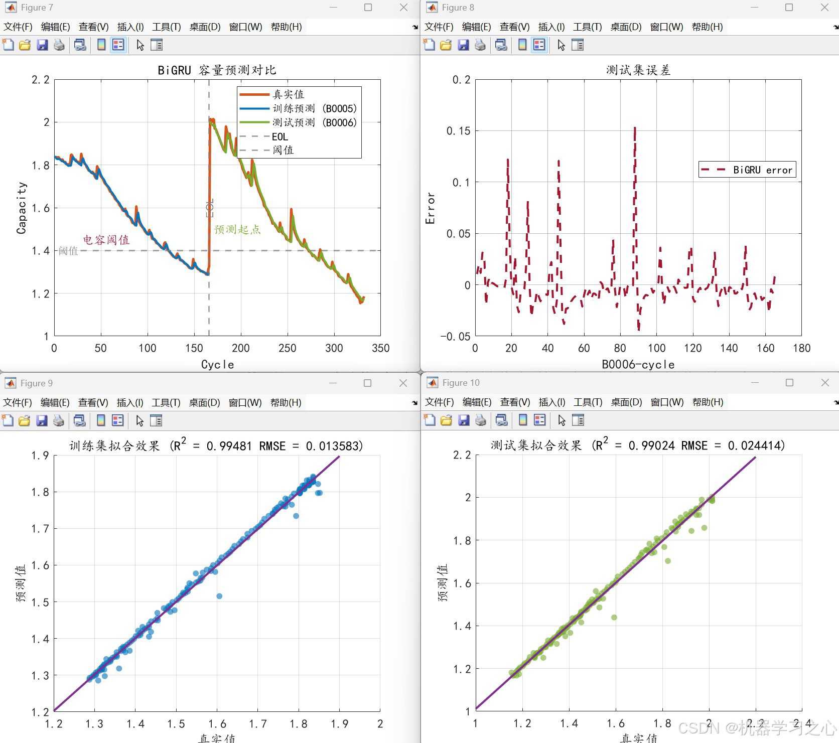 MATLAB代码实现了一个基于双向门控循环单元(BiGRU)的锂离子电池剩余寿命预测模型。
