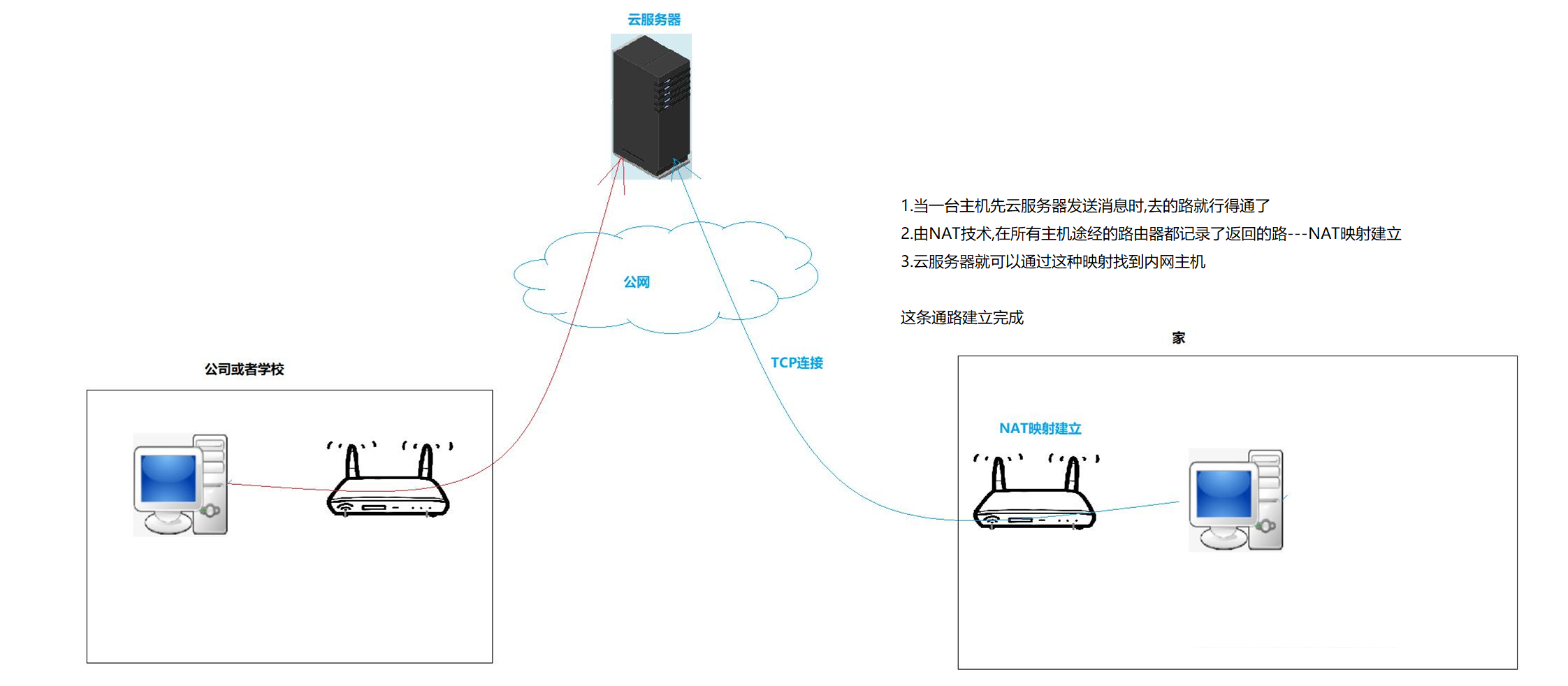 两台都在内网的设备,互相主动发包,在 NAT 上开"临时通道",实现直连。