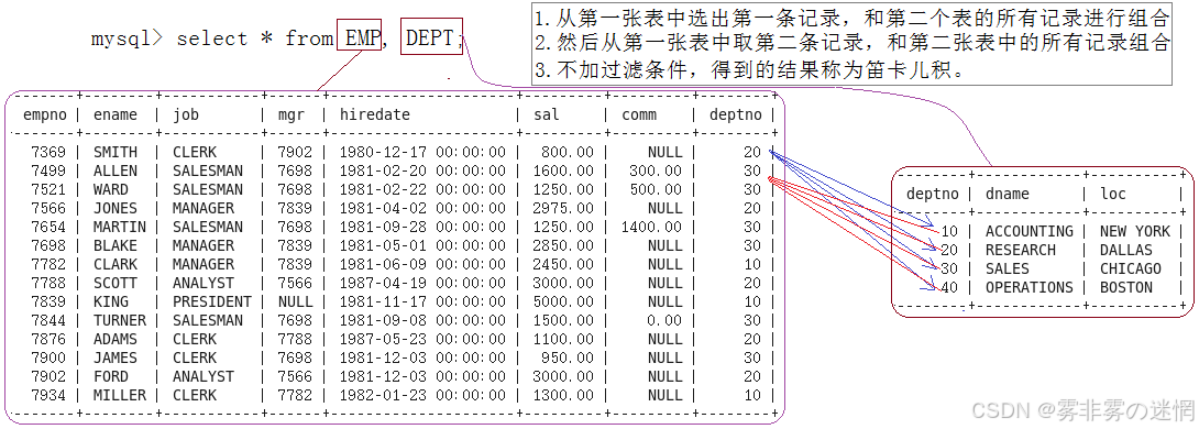 现在我们对两张表进行笛卡尔积:可以看到数据非常的乱,现在进行筛选