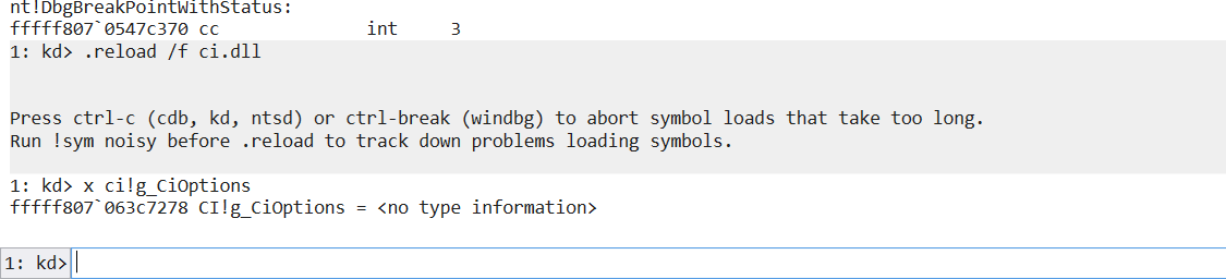 运行代码找到g_CiOptions 的内核地址是 0xFFFFF807063C7278