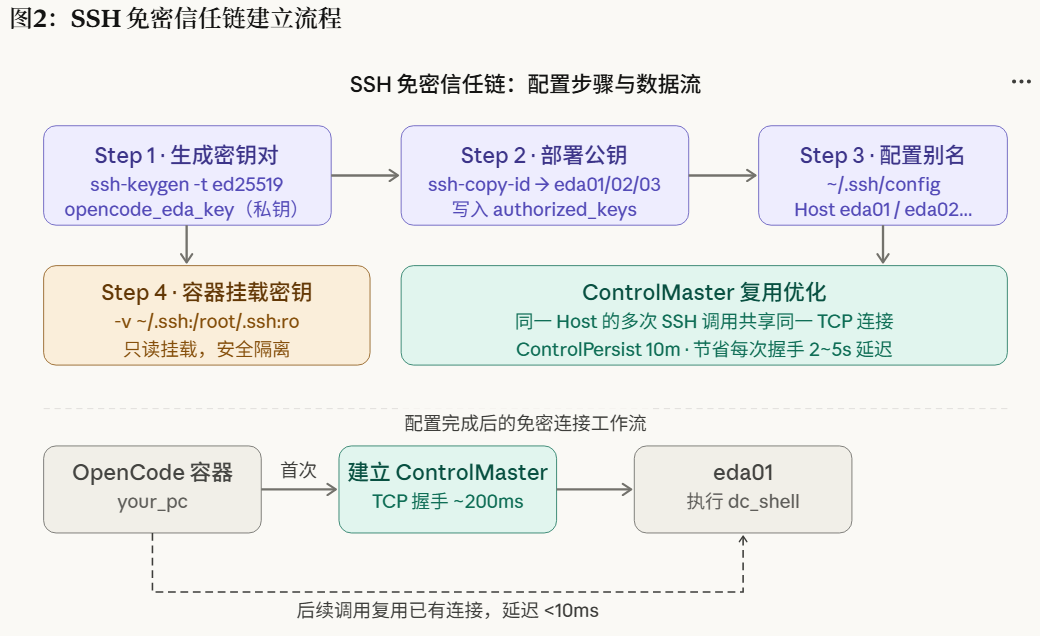 传统工作方式:工程师手动 SSH 登录 EDA 服务器,执行命令,再 SSH 回来取结果。这个过程本身没有问题,但一旦要让 OpenCode 替你完成这套操作------读文件、远程执行综合、取回报告、分析、再修改------就需要一套完整的 SSH 免密信任链。