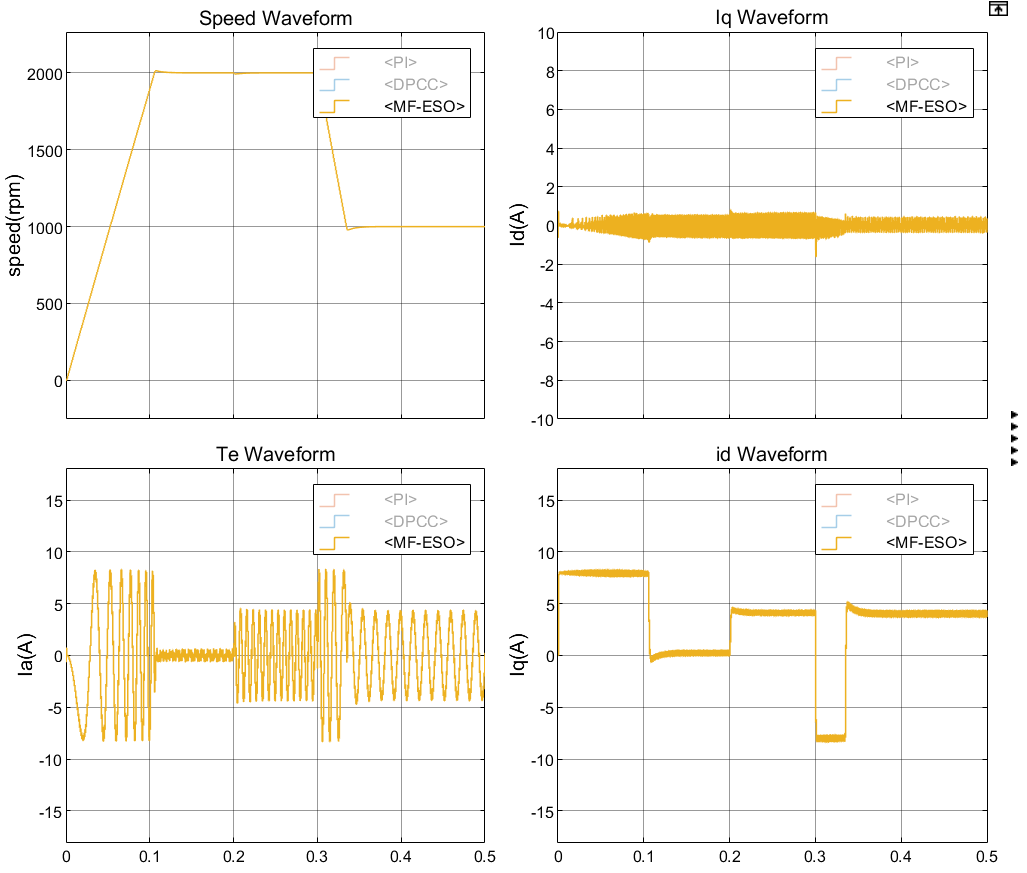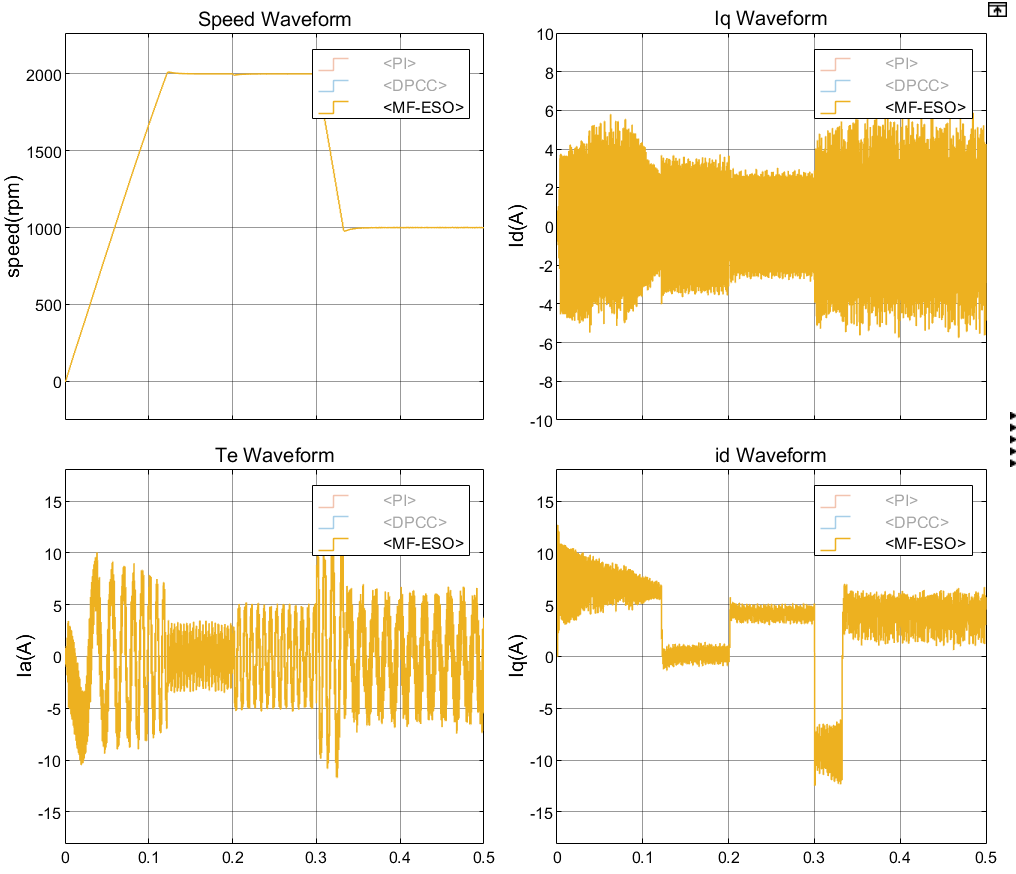 - 第二个角度是1000rpm额定负载工况稳态跟踪性能(稳态误差,电流idiq峰峰值),
