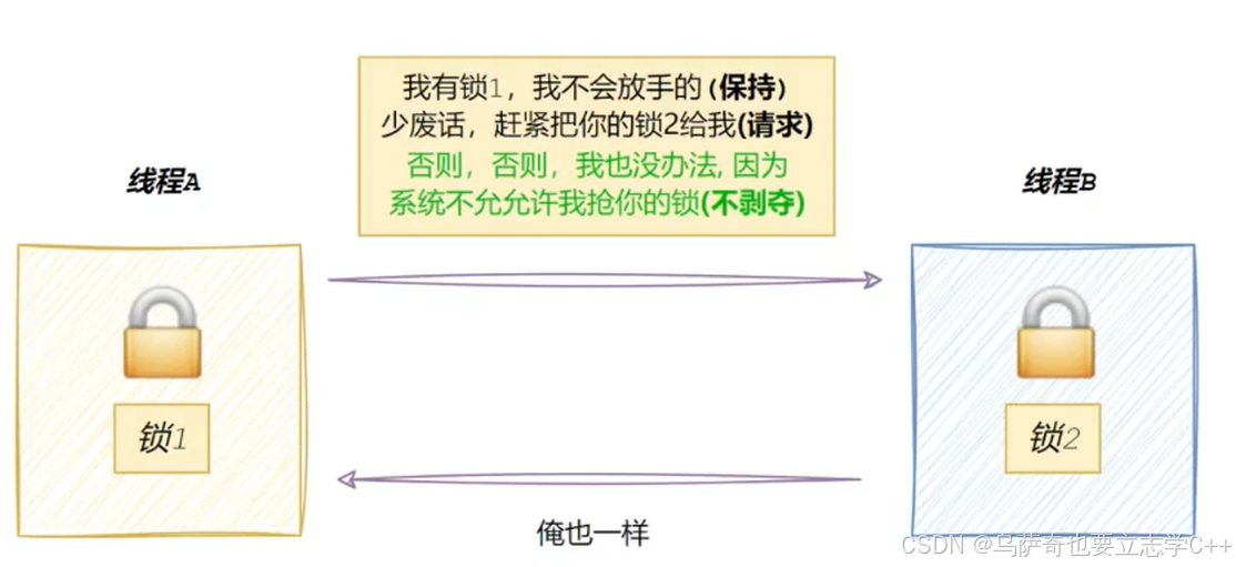 2、为了⽅便表述,假设现在线程A,线程B必须同时持有锁1和锁2,才能进⾏后续资源的访问
