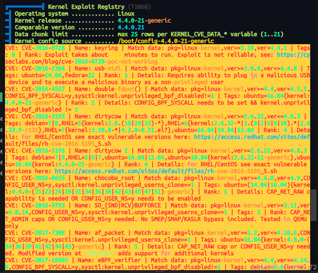 根据版本信息,我们可以知道这是 Ubuntu 16.04 的早期内核,存在多个可以直接导致 Root 权限提升 的重量级内核漏洞: