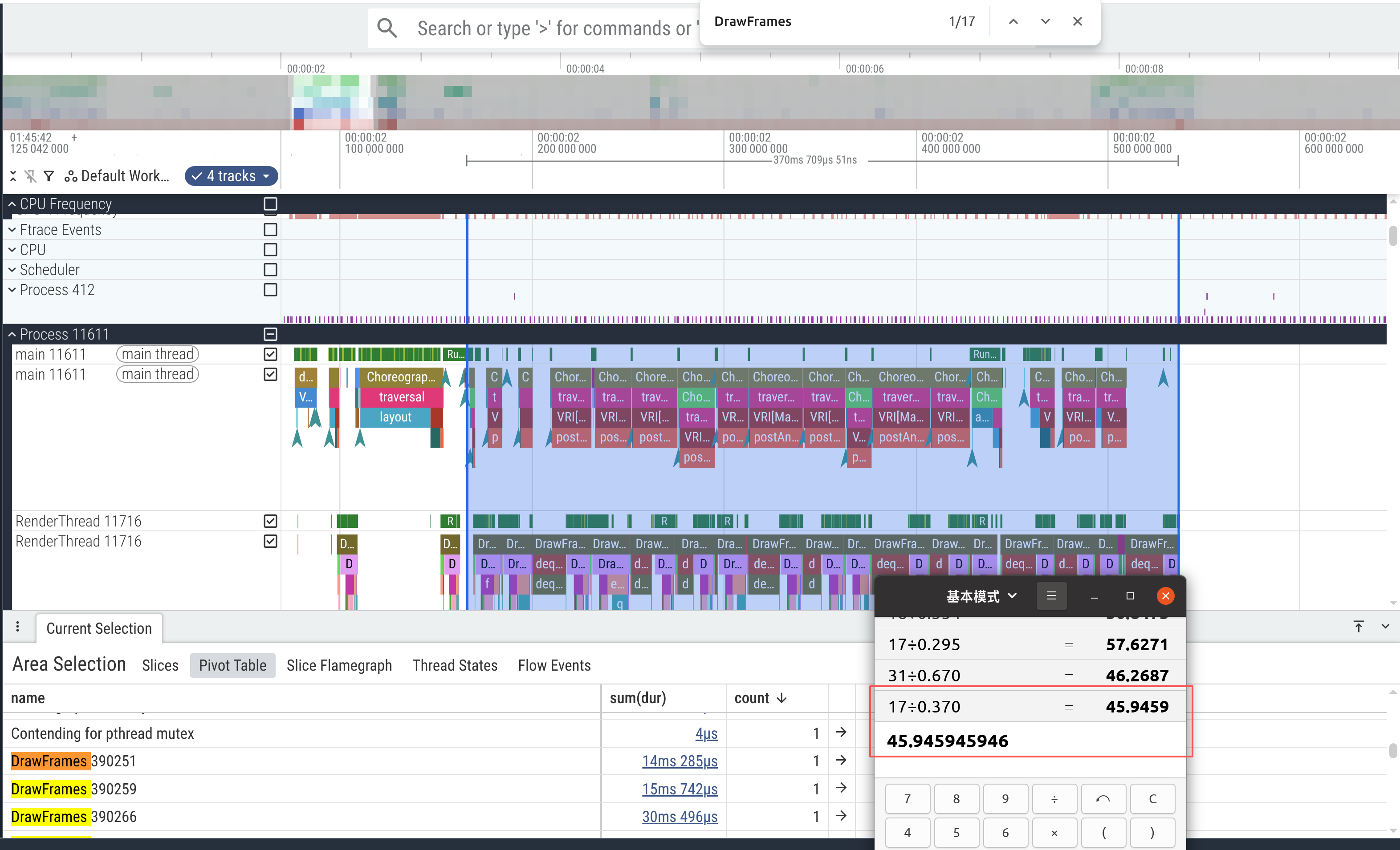 计算帧率:45.94fps,这里计算时抛掉前面明显的在案件按键之后layout耗时,因为该问题原因已知。