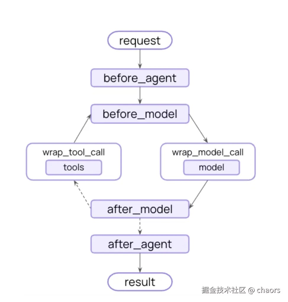 Middleware(中间件)是一种 钩子(Hook)机制,它允许你在核心调用链路(如向LLM发起请求、调用工具、处理输出)的特定阶段注入自定义逻辑,而无需修改核心 Agent 或工具的代码。