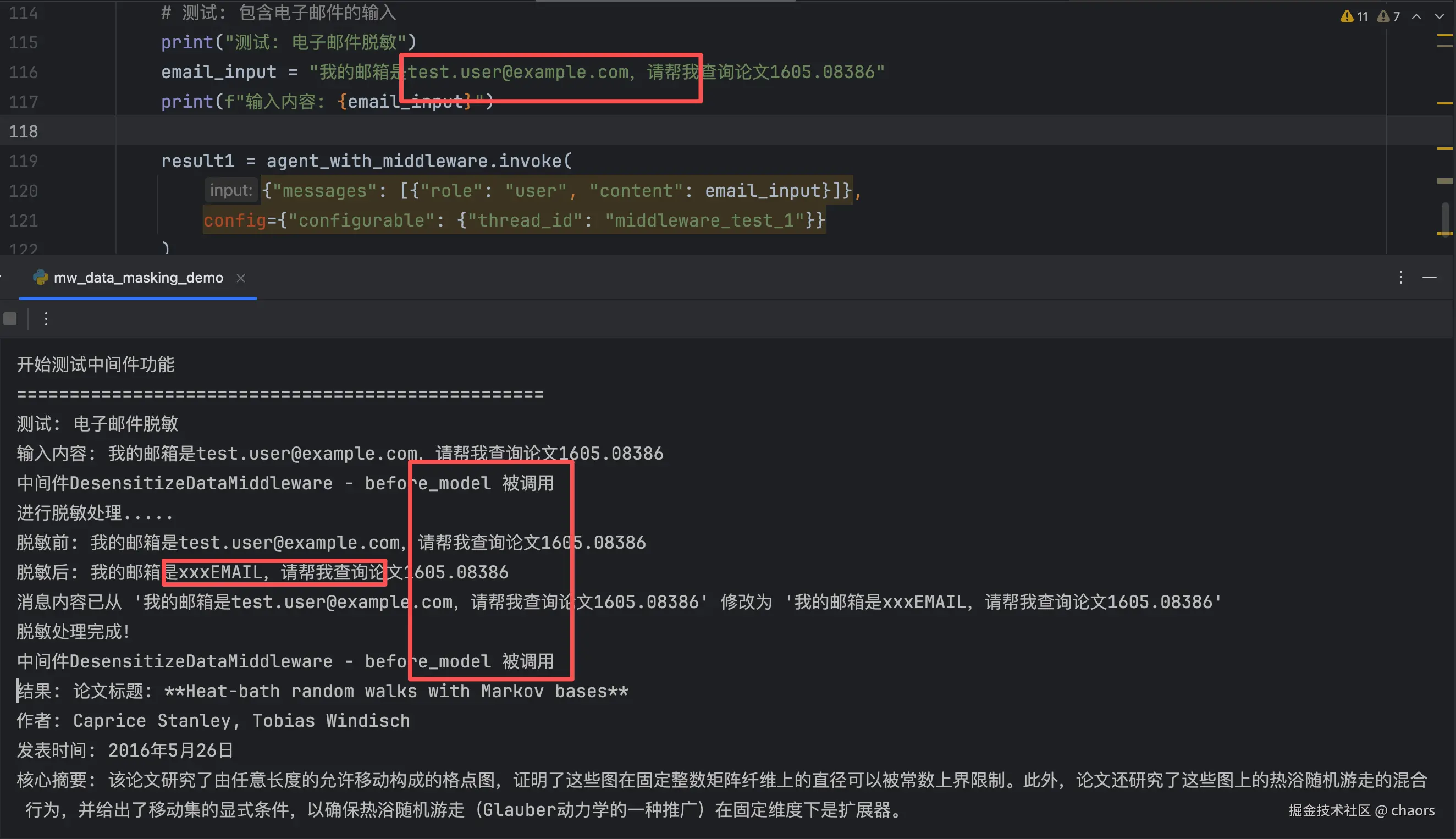 现在定义一个 信息脱敏中间件 ,用于在和 LLM 交互过程中隐藏电话号码、邮箱等敏感信息。废话少说上代码。