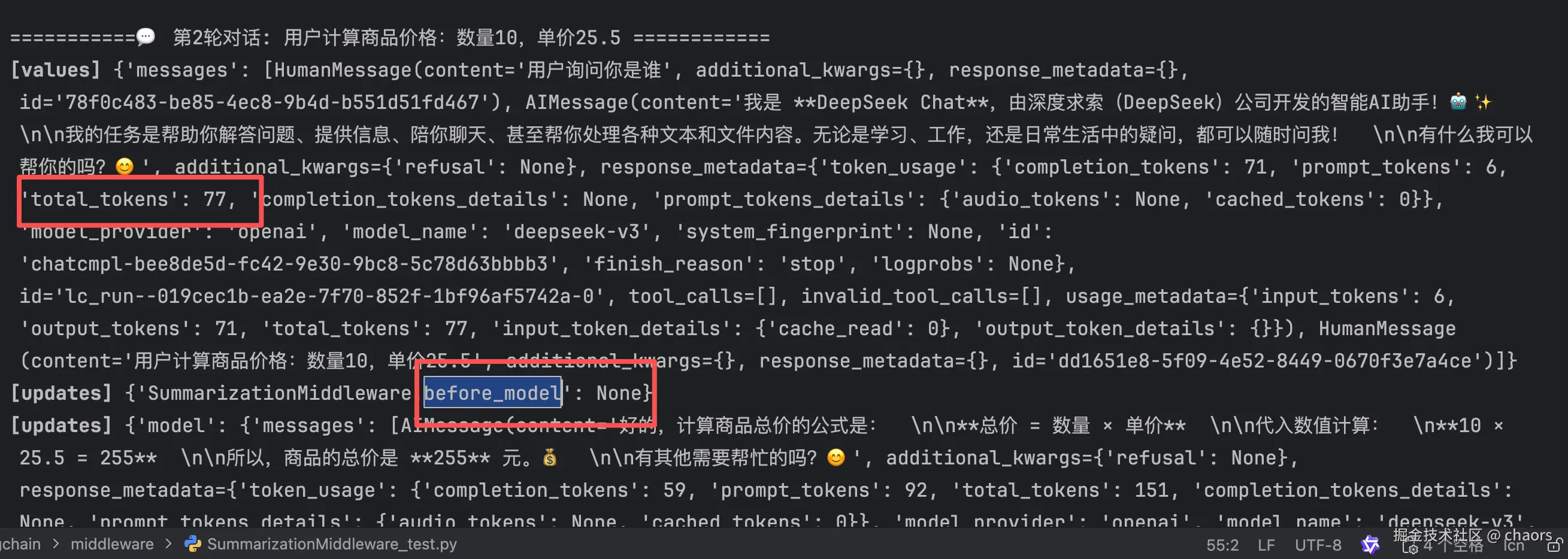 我们继续看第二轮对话,before_model 依然未执行。为什么呢?我们可以看出目前total_tokens(77) < 120,所以未触发。