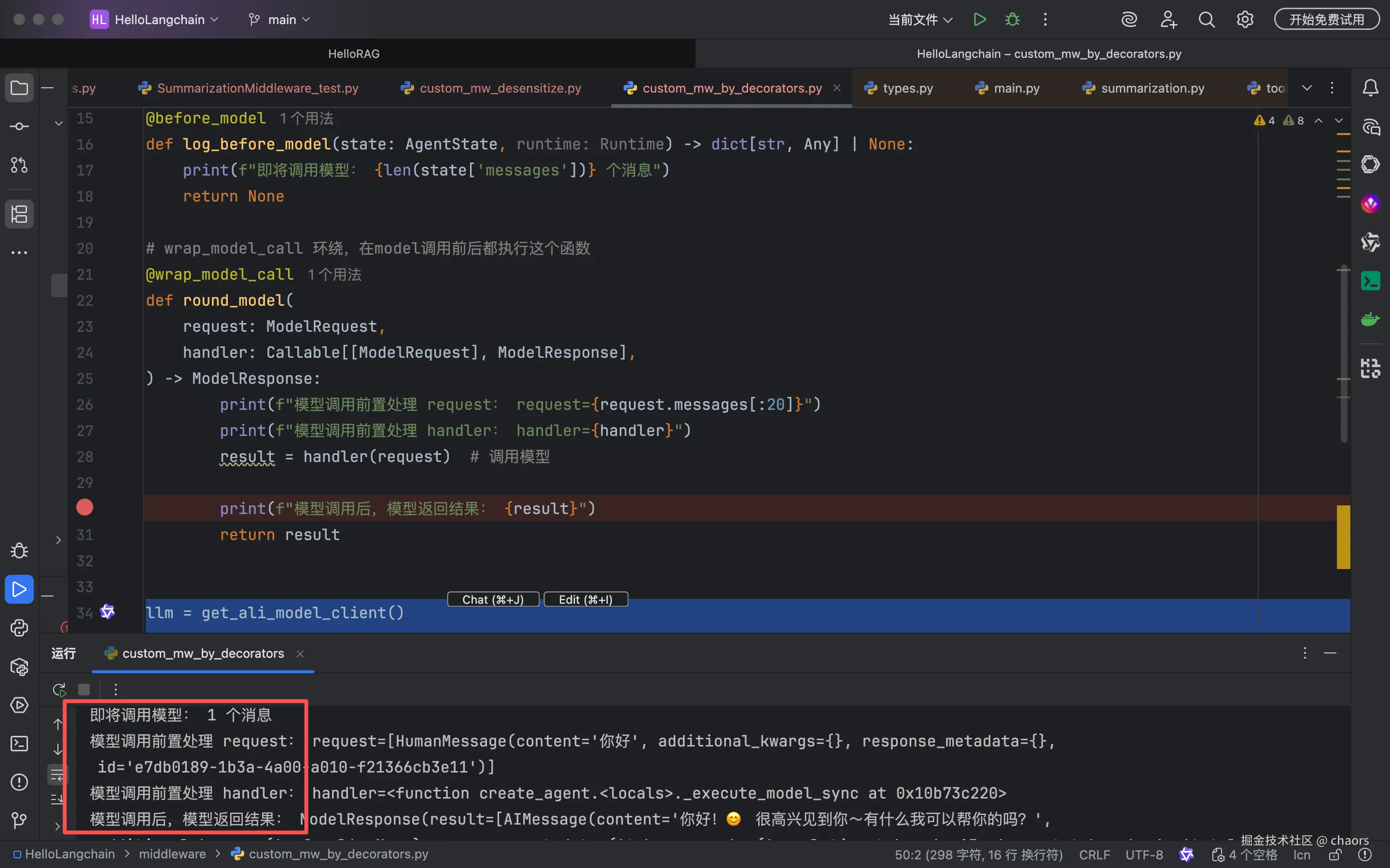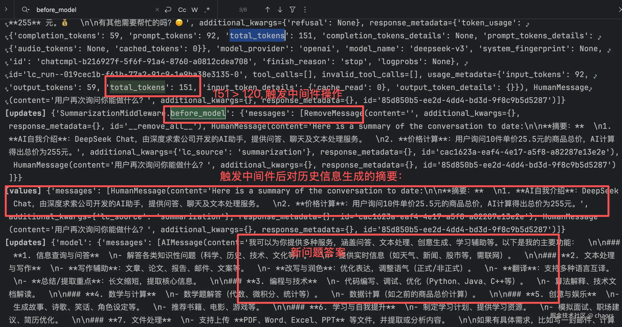 我们发现,Log里有个summarizationMiddleware.before_model。这里的before_model就是一个 hook 函数,他负责在 model 之前执行摘要操作。但是这里值为None,表示该中间件并未执行。
