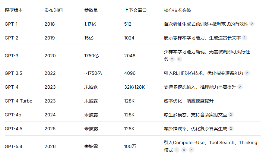 自2018年OpenAI发布第一代GPT模型以来,生成式预训练Transformer架构经历了七年的快速迭代,从1.17亿参数扩展到万亿级混合专家模型,从单纯的文本生成演进为具备计算机操作能力的AI代理。本文深度拆解GPT系列模型的核心技术架构,包括Transformer底层原理、自回归训练机制、RLHF对齐技术、以及最新GPT-5.4引入的百万Token上下文与Computer-Use能力,为开发者提供从理论到工程实践的全景式技术解读。 文章还包含关键代码示例和技术参数对比,帮助读者理解大模型的技术演进逻辑。