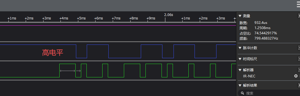 高电平约为930us 低电平约为320us 周期约为1.25ms 为高电平