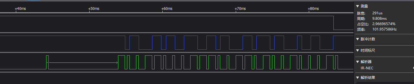 高电平约为295us 低电平约为9.5ms 周期约为9.8ms