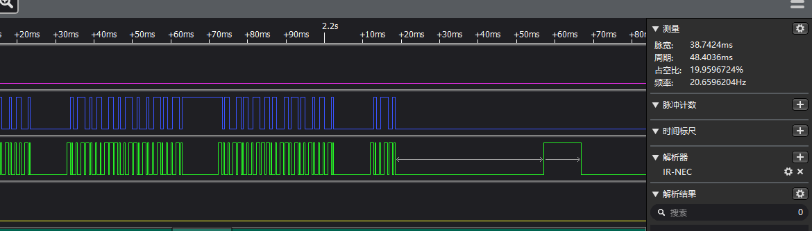 2:借助其他io口在进入每位翻转,解码完整翻转,知道哪里出错,知道解码某一帧数据,很多遥控器发送一帧数据不止一个信号,而是多个信号,这样也是为了防止码值出错或被干扰
