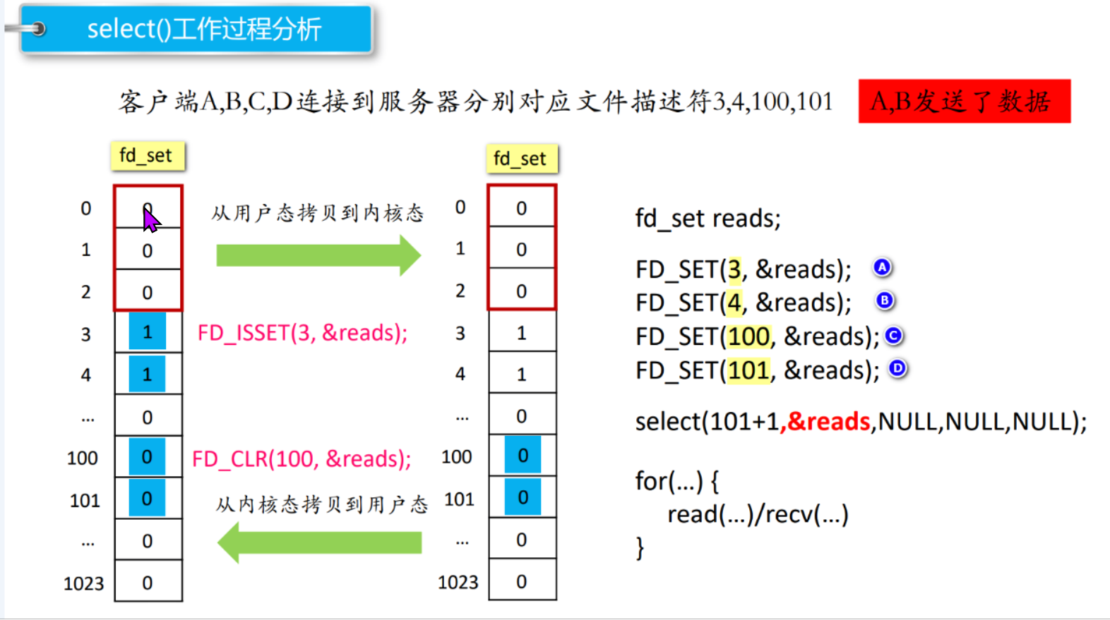 - 调用select函数:select(nfsd,&readfds,NULL,NULL,NULL);